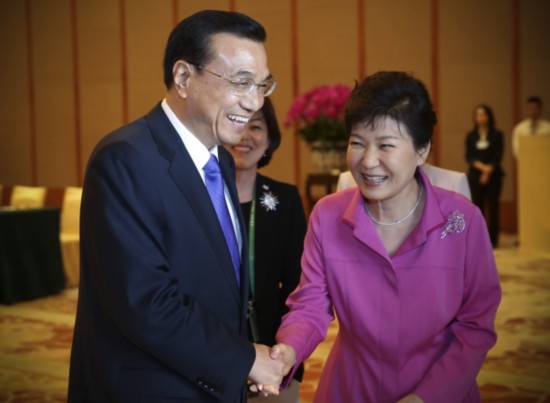 韓國總統樸槿惠對李克強總理表示:"韓中日三國合作有利于地區和平穩定。要引導日本抱著正確的歷史觀,為東北亞和平做出貢獻。"