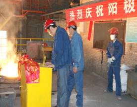 2012年7月7日上午11點零19分,青海物產工業投資有限公司10萬噸電解鋁/年升級改造項目,簡易陽極組裝車間大門前鞭炮齊鳴。青海物產工業投資有限公司黨總支副書記、青海長春炭素有限公司總經理王松華,公司常務副總經理、項目副總指揮常海寧,工業投資和長春炭素公司副總經理姜紅萍,公司副總經理張秉瑜,總經理助理范登福等公司領導和各車間、部室的職工出席了簡單的點火澆鑄儀式。王松華同志按下了點火按鈕鄭重宣布澆鑄正式開始。當中頻爐工將第一爐鐵水倒入抬包時,標志著新陽極組裝車間正式投產運行。
